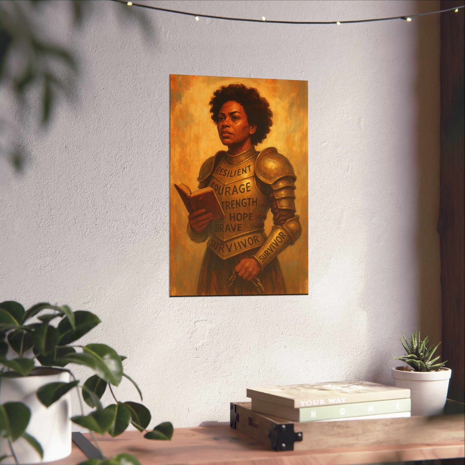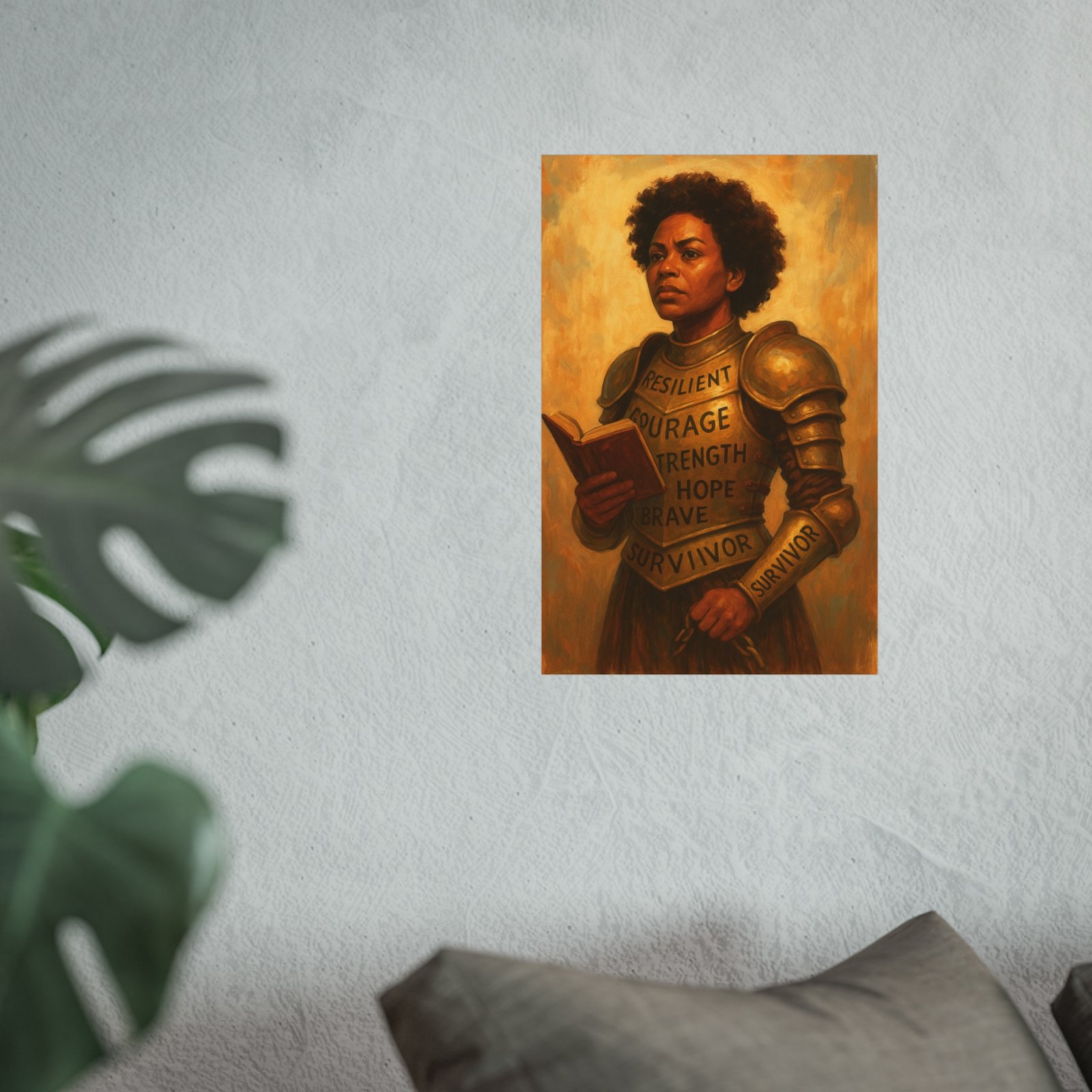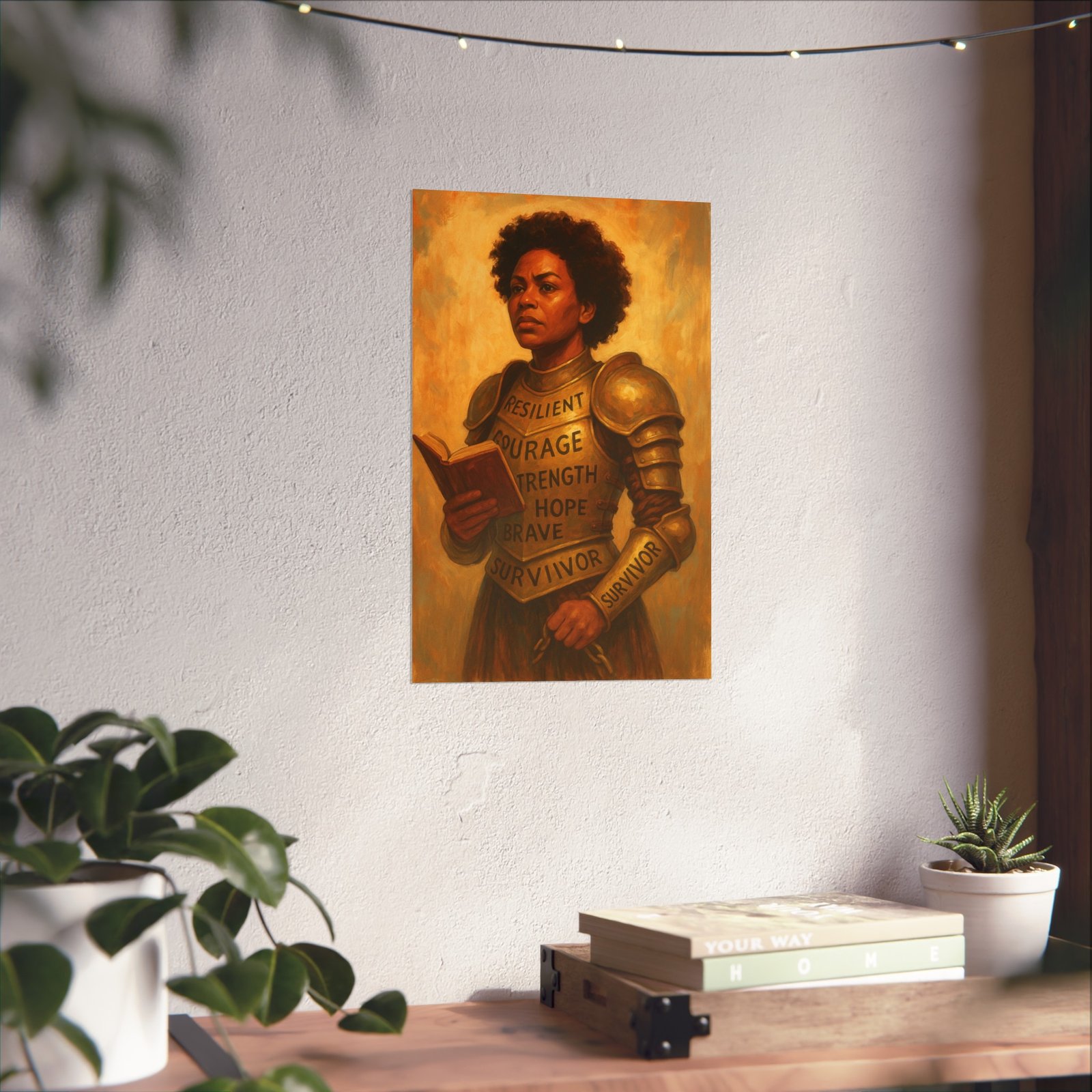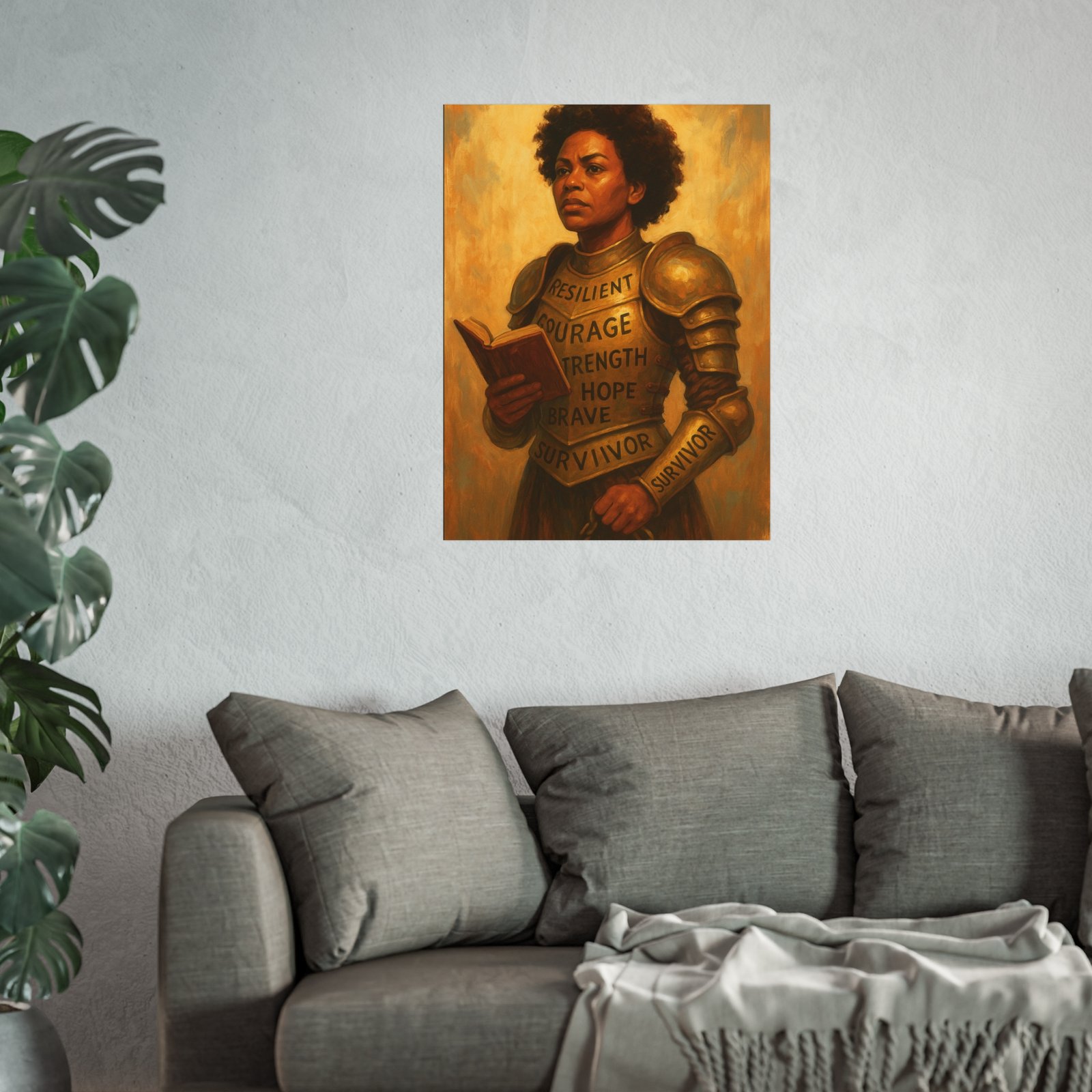 Transform your space with this empowering fine art poster, part of the Still Rising collection. Featuring a stunning illustration of a woman clad in golden armor inscribed with words of resilience, this artwork is a tribute to those who have turned their pain into power. Holding a book close to her heart, she stands as both a warrior and a writer—a symbol of healing, truth, and strength.