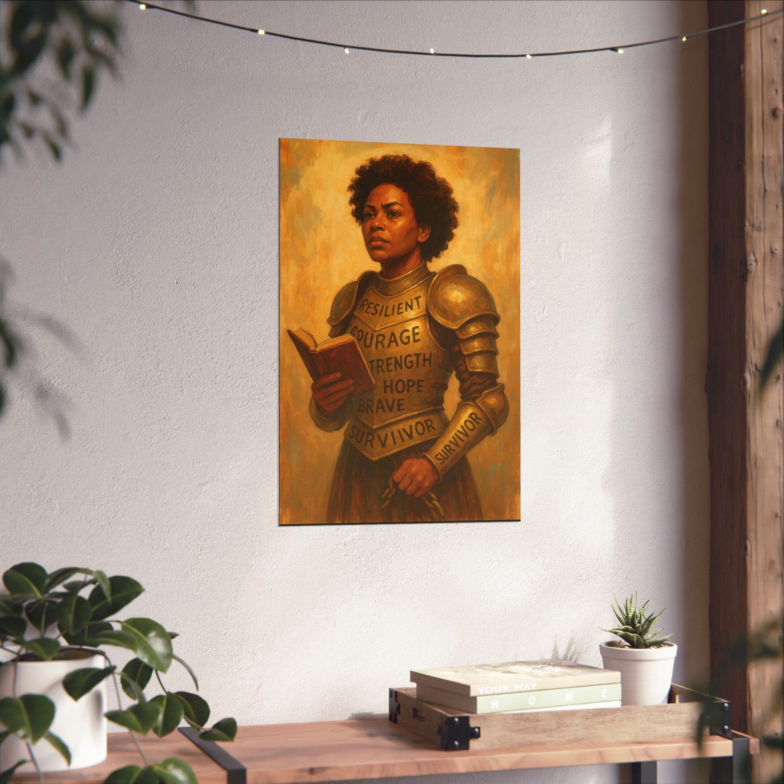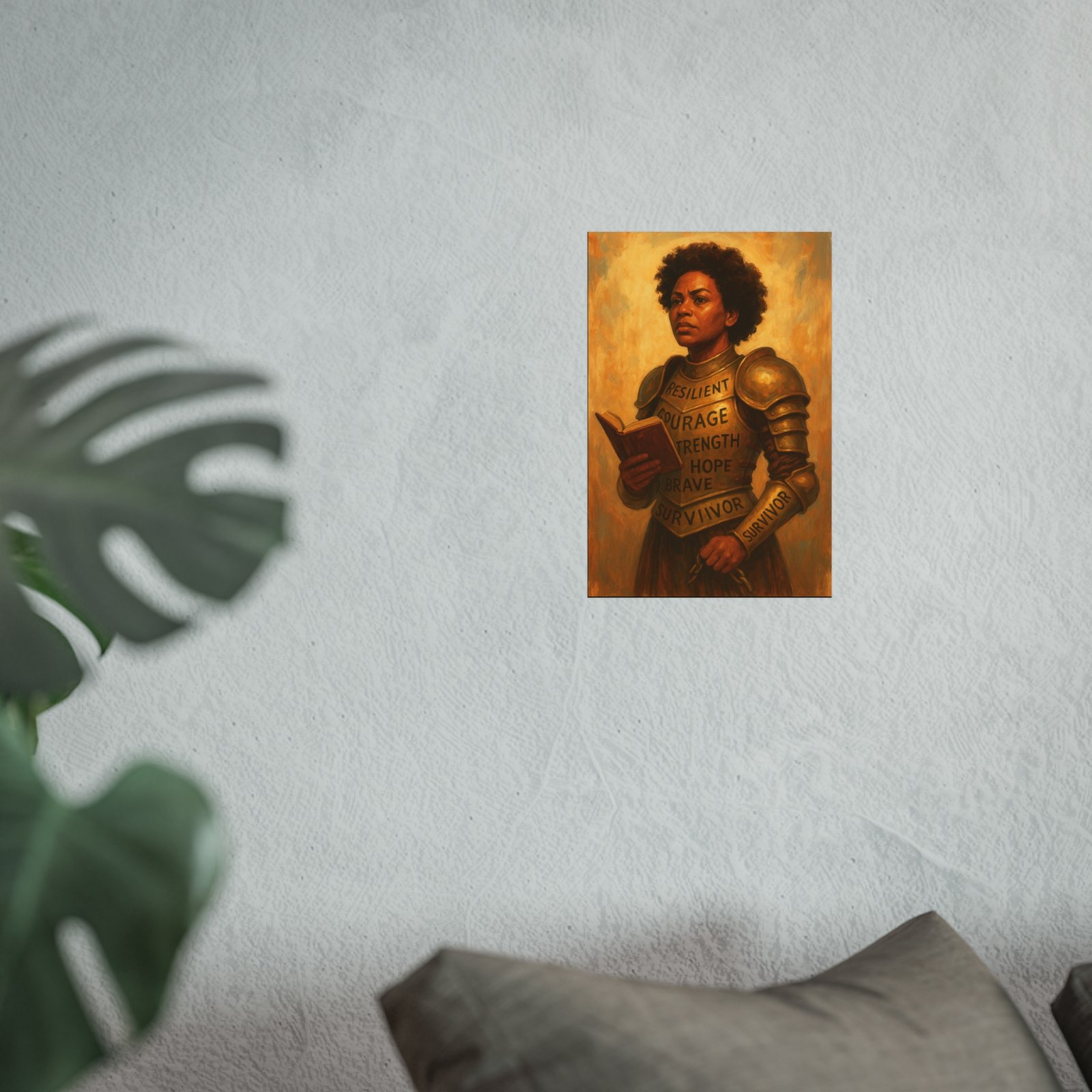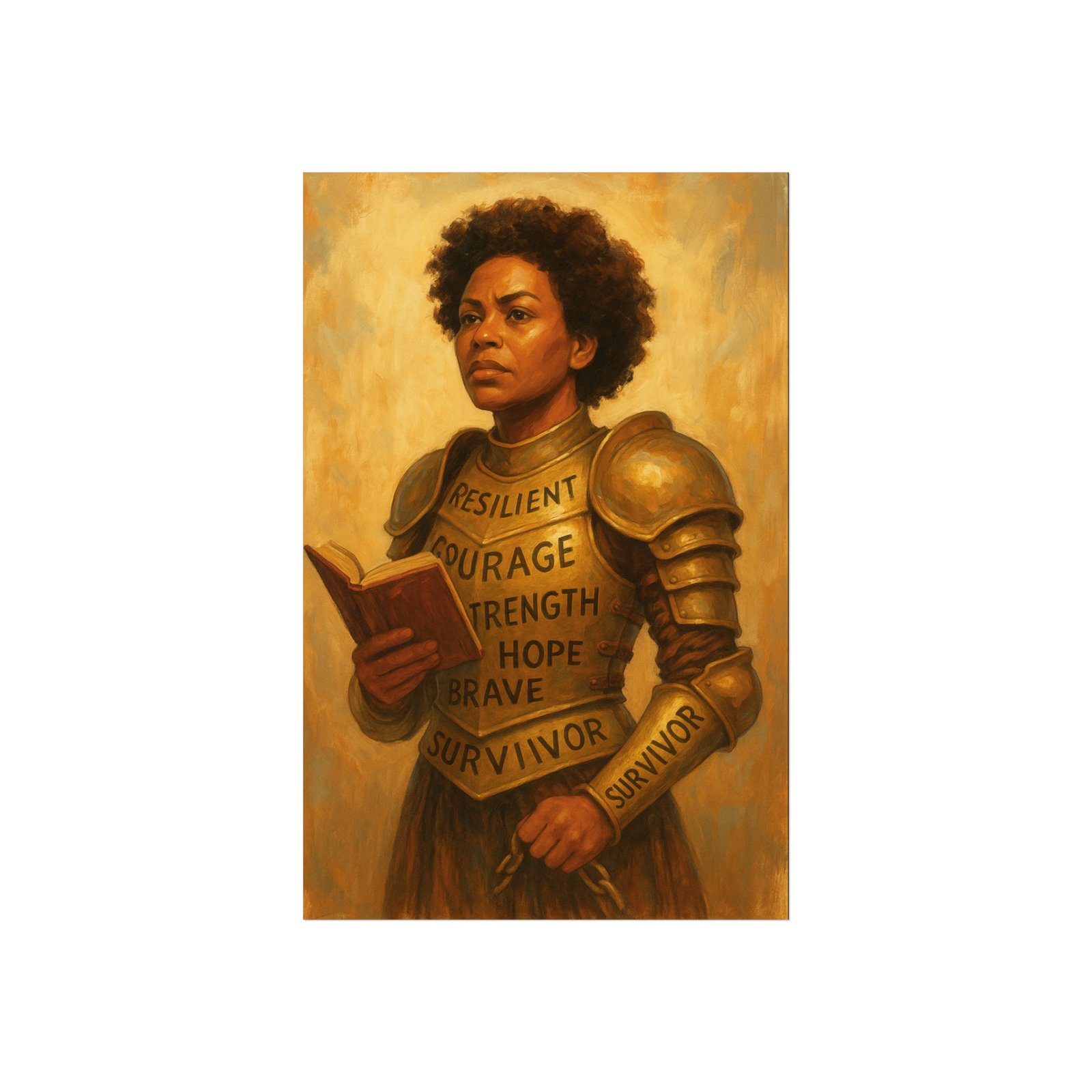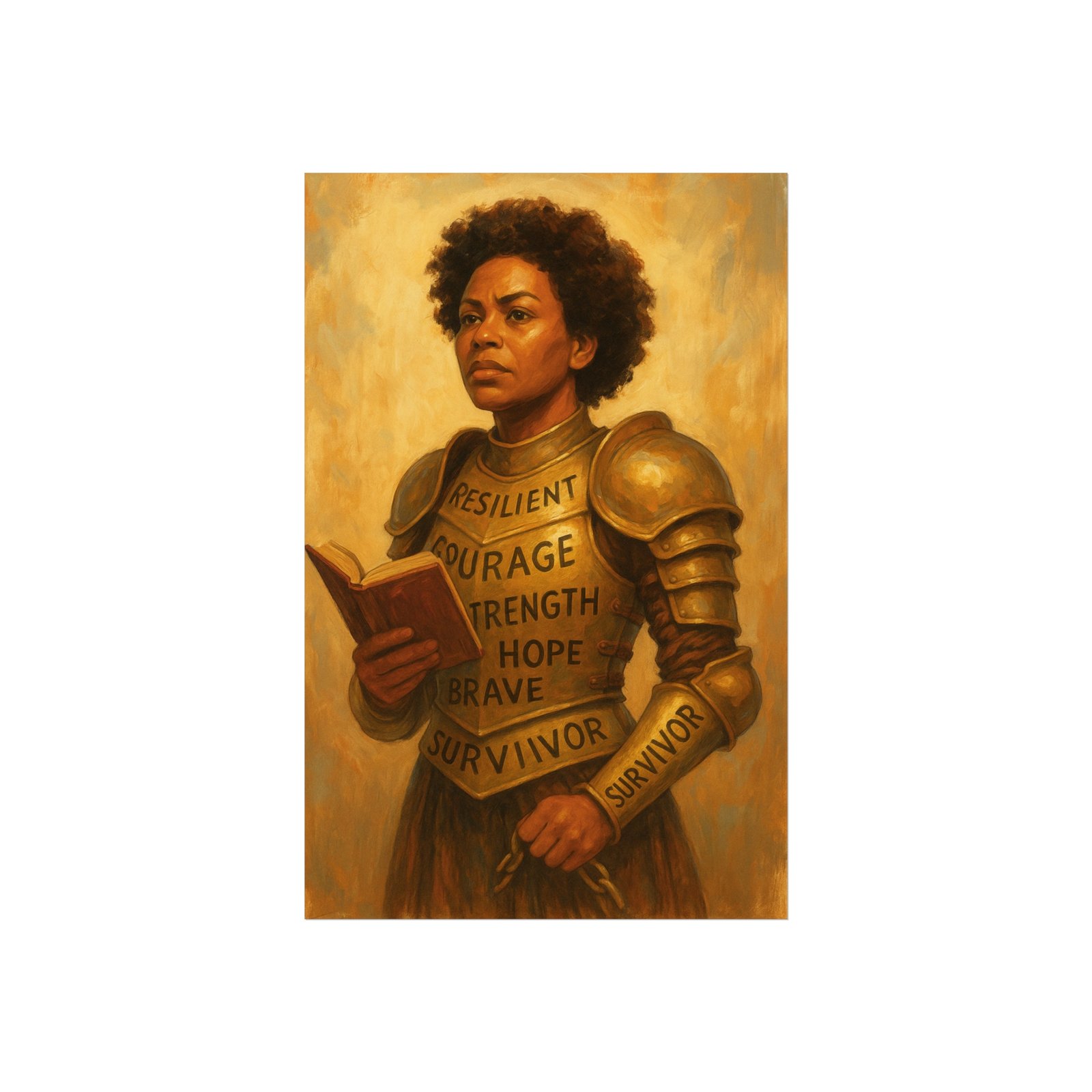 Transform your space with this empowering fine art poster, part of the Still Rising collection. Featuring a stunning illustration of a woman clad in golden armor inscribed with words of resilience, this artwork is a tribute to those who have turned their pain into power. Holding a book close to her heart, she stands as both a warrior and a writer—a symbol of healing, truth, and strength.