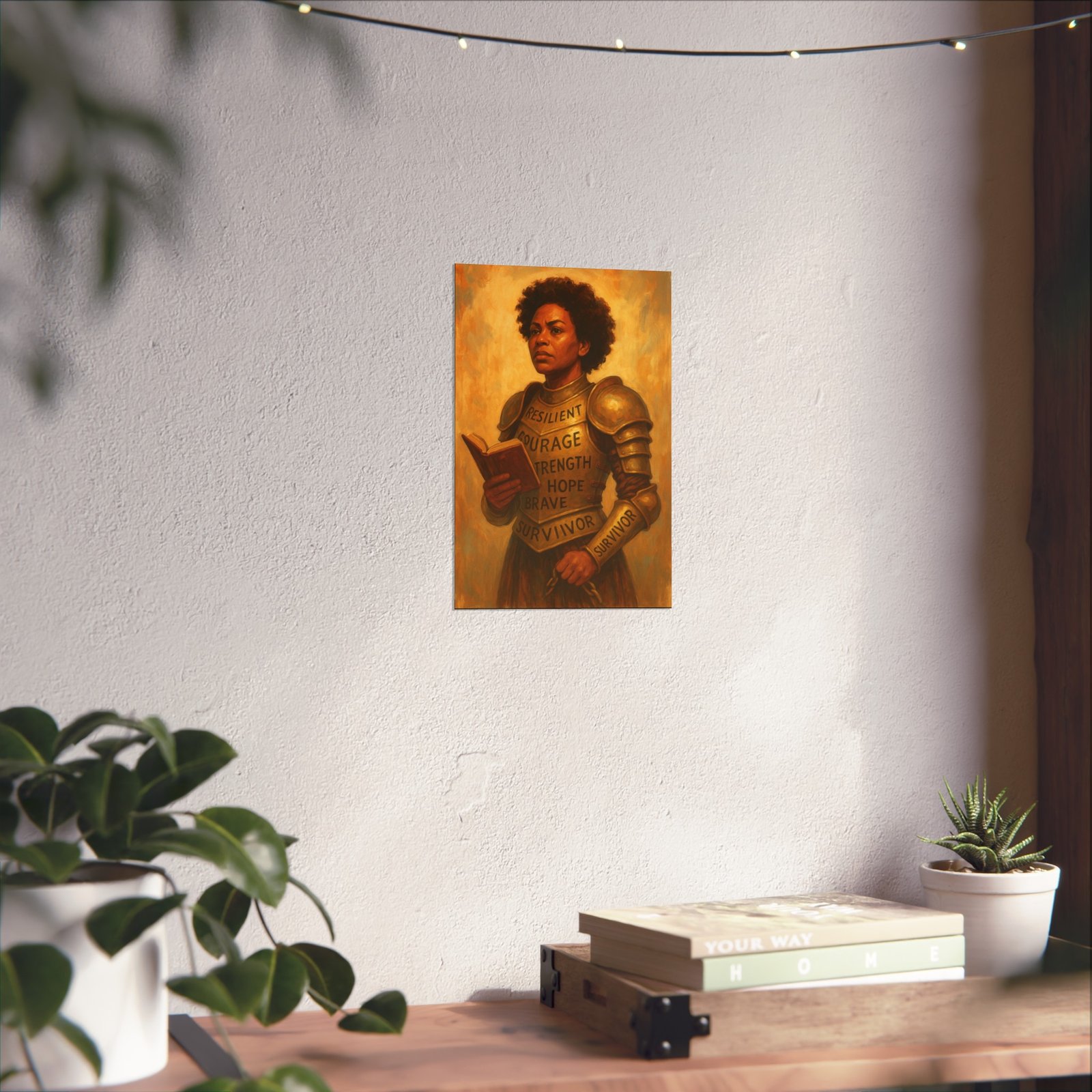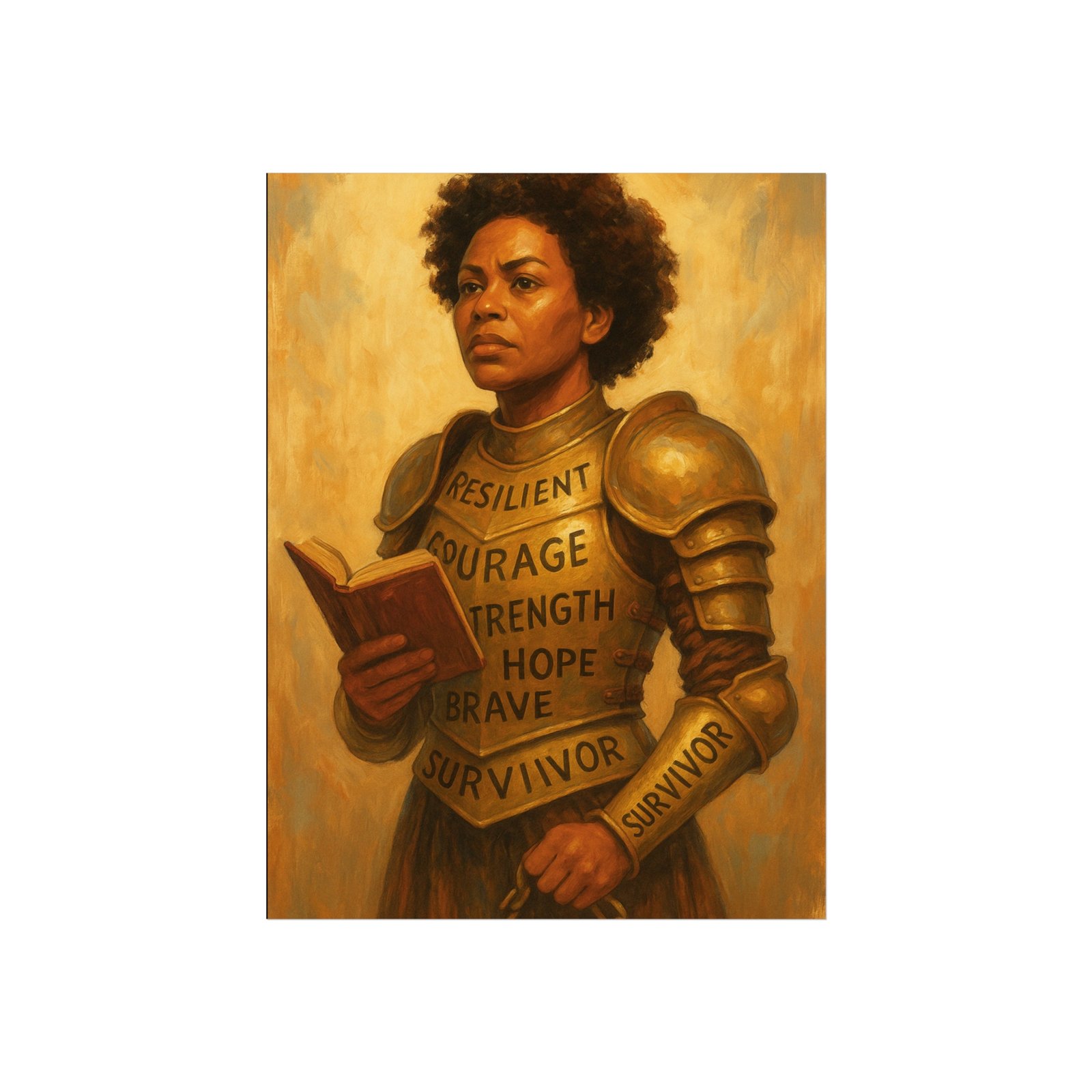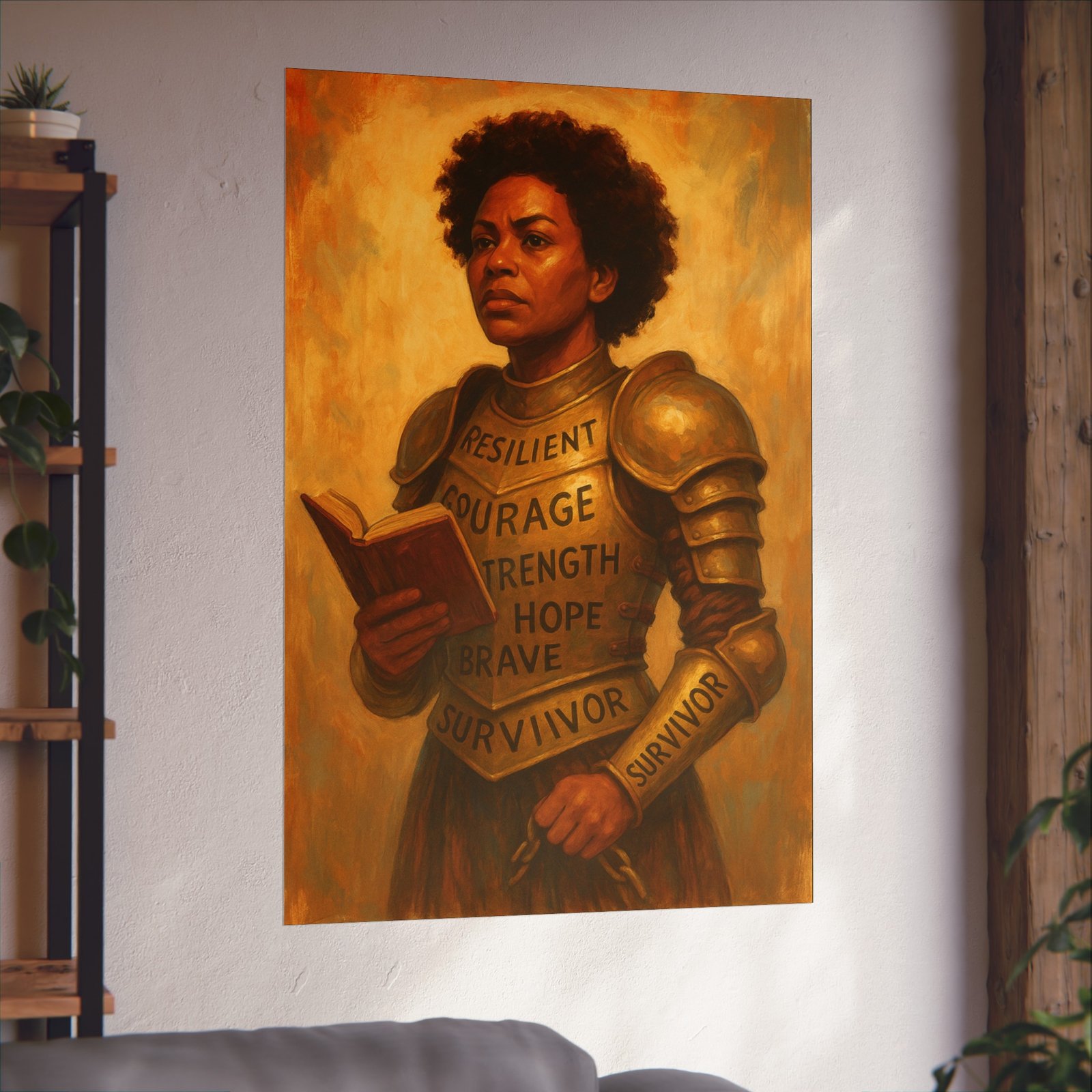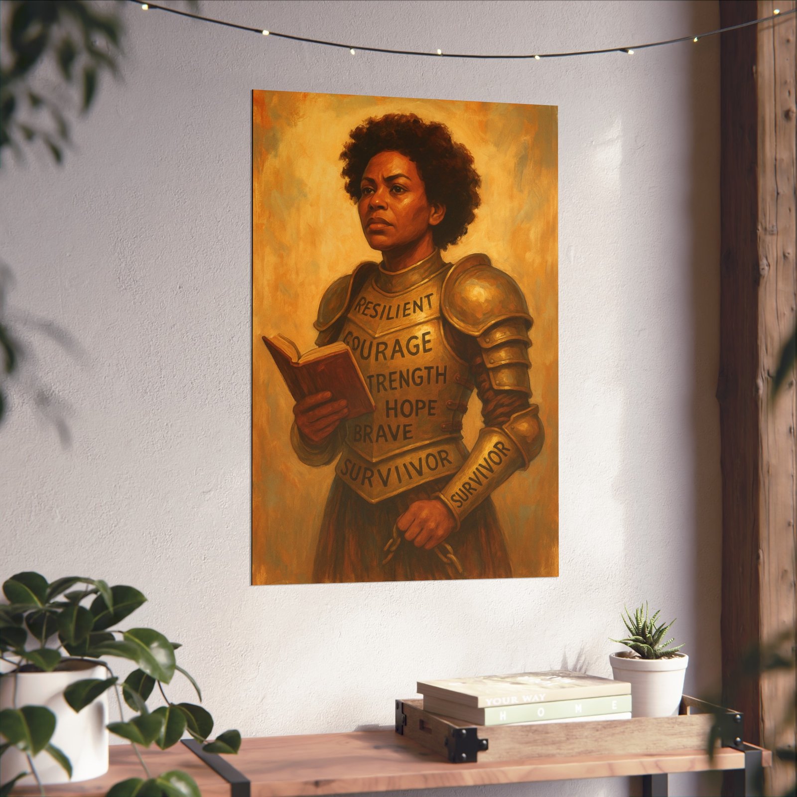 Transform your space with this empowering fine art poster, part of the Still Rising collection. Featuring a stunning illustration of a woman clad in golden armor inscribed with words of resilience, this artwork is a tribute to those who have turned their pain into power. Holding a book close to her heart, she stands as both a warrior and a writer—a symbol of healing, truth, and strength.