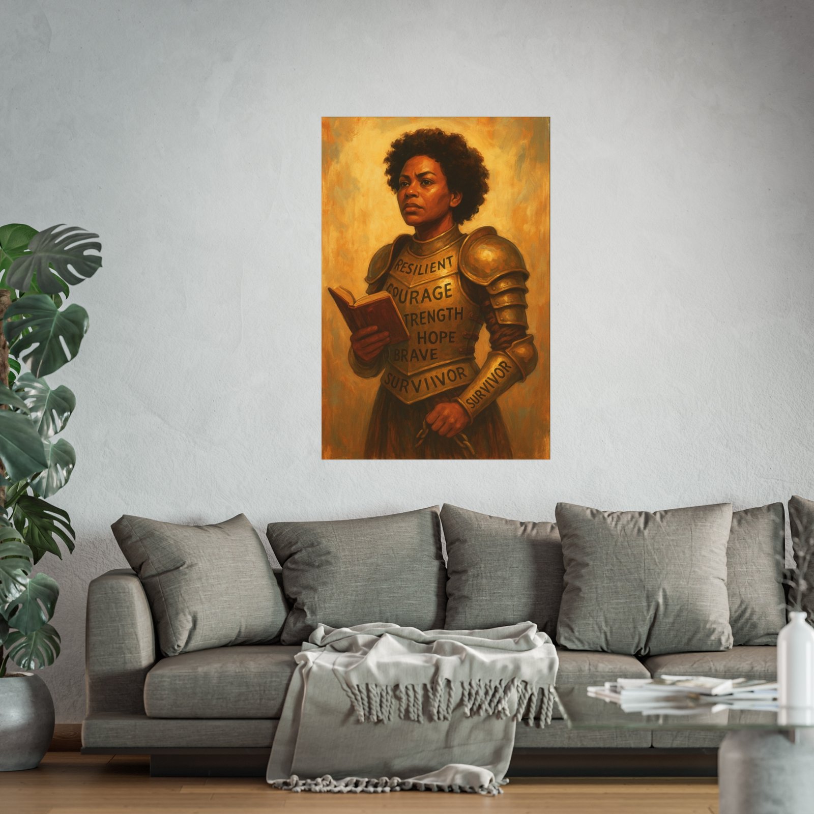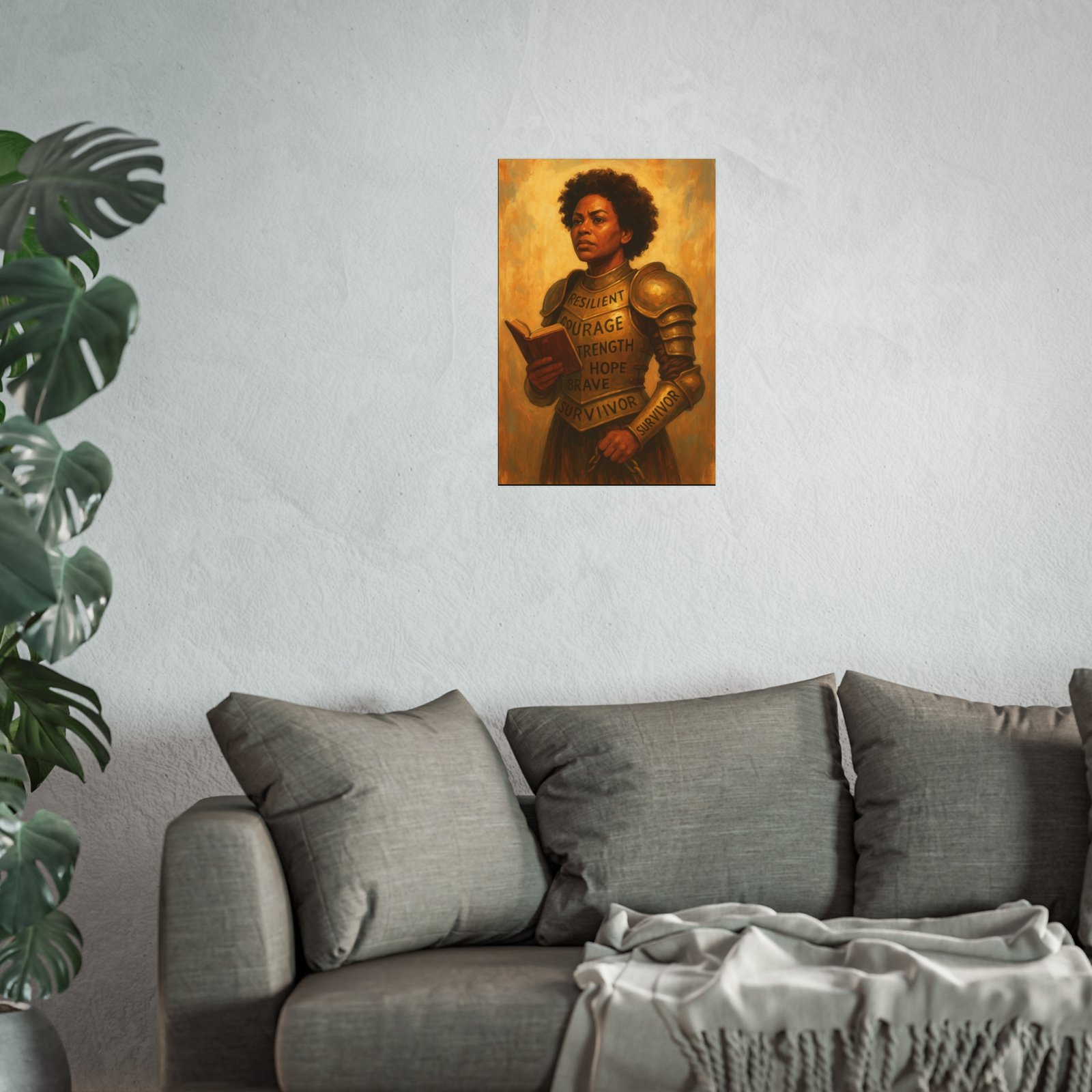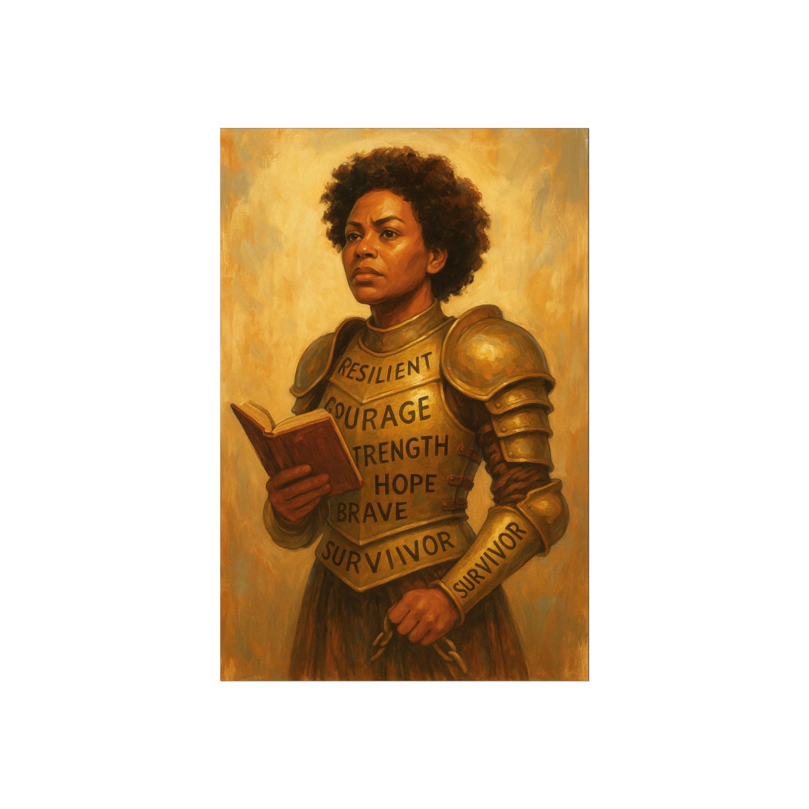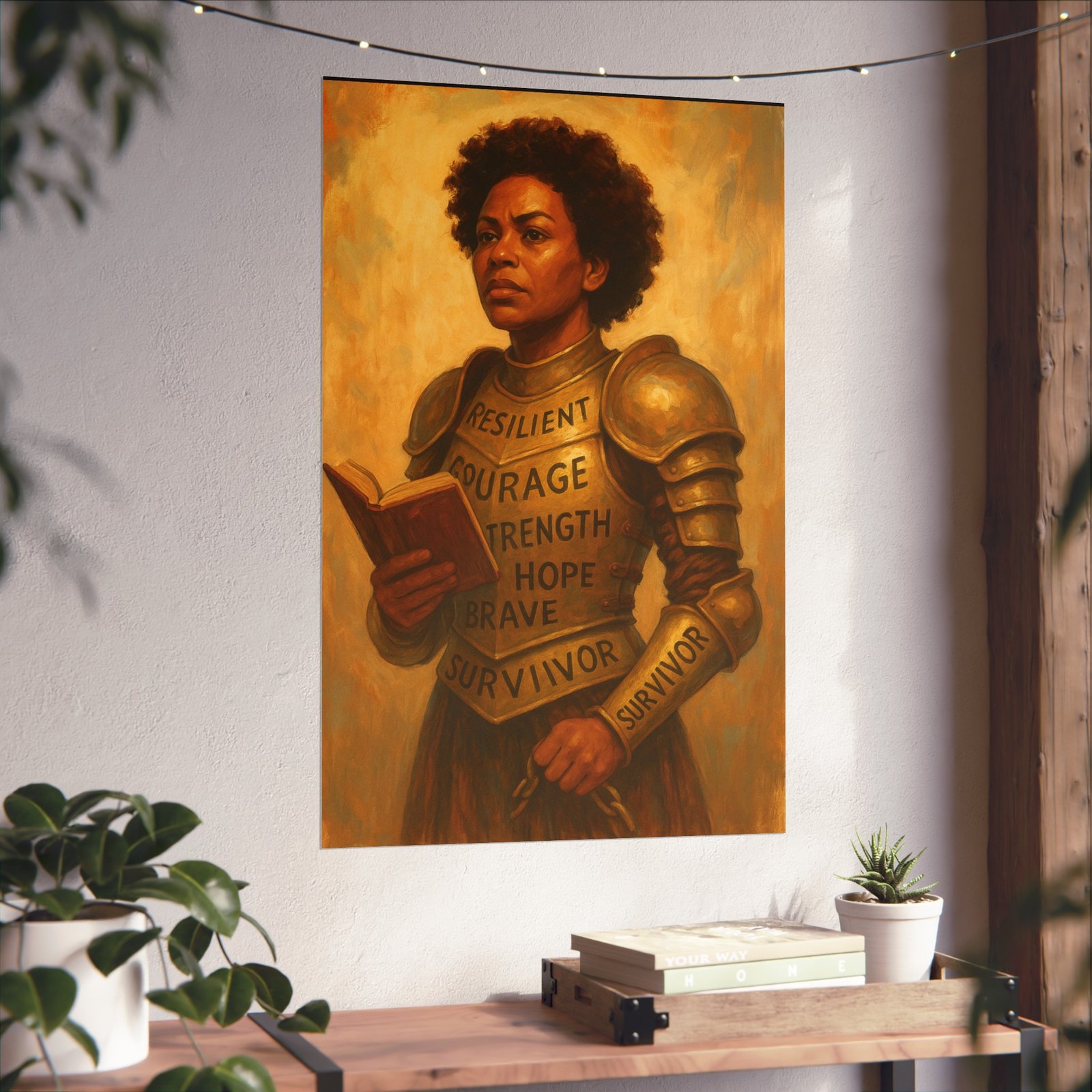 Transform your space with this empowering fine art poster, part of the Still Rising collection. Featuring a stunning illustration of a woman clad in golden armor inscribed with words of resilience, this artwork is a tribute to those who have turned their pain into power. Holding a book close to her heart, she stands as both a warrior and a writer—a symbol of healing, truth, and strength.