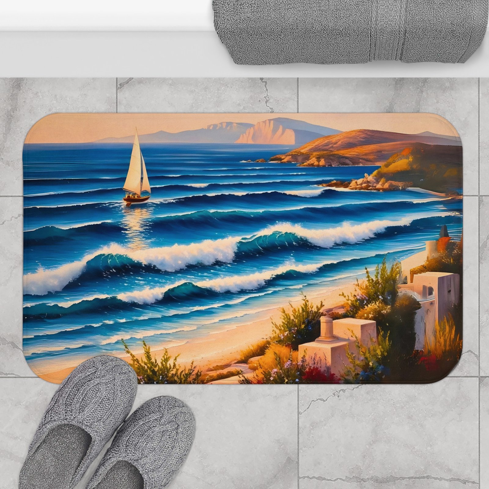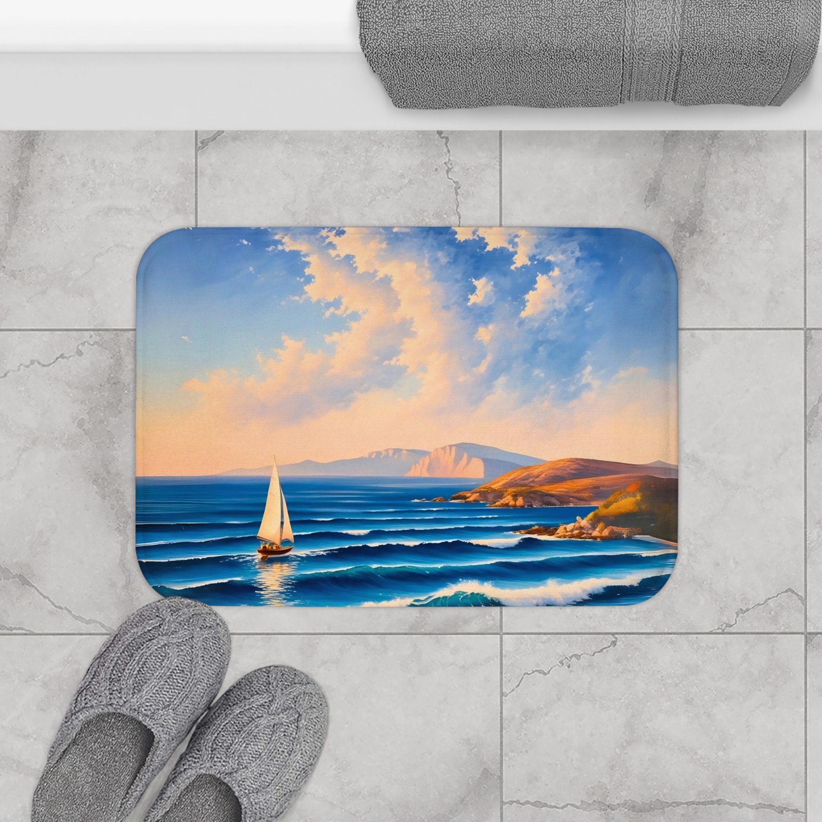 Transform your bathroom into a serene oasis with this stunning Bath Mat, featuring a breathtaking coastal scene that invites tranquility. The soft memory foam microfiber ensures every step feels cushioned and comfortable, making it perfect for those tranquil mornings and relaxing evenings. Designed for anyone who cherishes a soothing atmosphere in their home, this bath mat is ideal for beach lovers and anyone looking to infuse a touch of nature into their daily routine. It’s a fantastic addition for summer decorations, coastal-themed interiors, or as a thoughtful gift for housewarming parties and holidays. Elevate your bath experience with this beautiful blend of functionality and art.