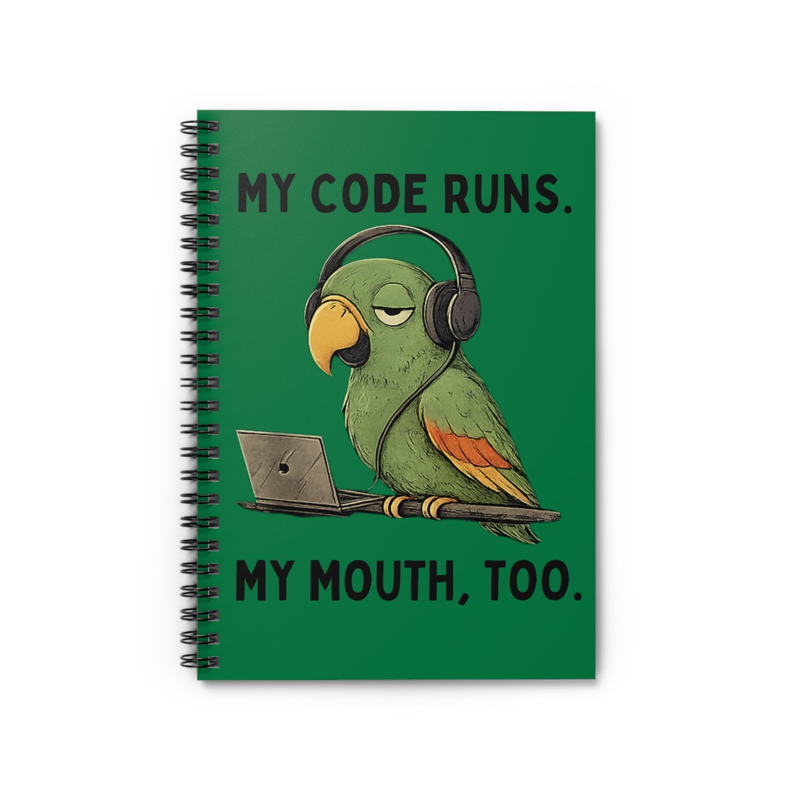 This spiral notebook brings humor and personality to everyday coding and note-taking. The front features a cheeky parrot illustration wearing headphones and working on a laptop, with the bold caption “MY CODE RUNS. MY MOUTH, TOO.” The 6″ x 8″ ruled pages offer a comfortable, compact size that slips into backpacks or laptop bags. A sturdy metal spiral lets the notebook lay flat or fold back for quick notes, while a document pocket on the inside back cover keeps loose papers or reference snippets close at hand. Thick 350gsm covers protect 118 smooth 90gsm ruled pages — great for jotting ideas, debugging thoughts, meeting notes, or sketching out algorithms. The dark grey back cover and full-color front print give it a polished, playful look that stands out on a desk or coffee shop table.
