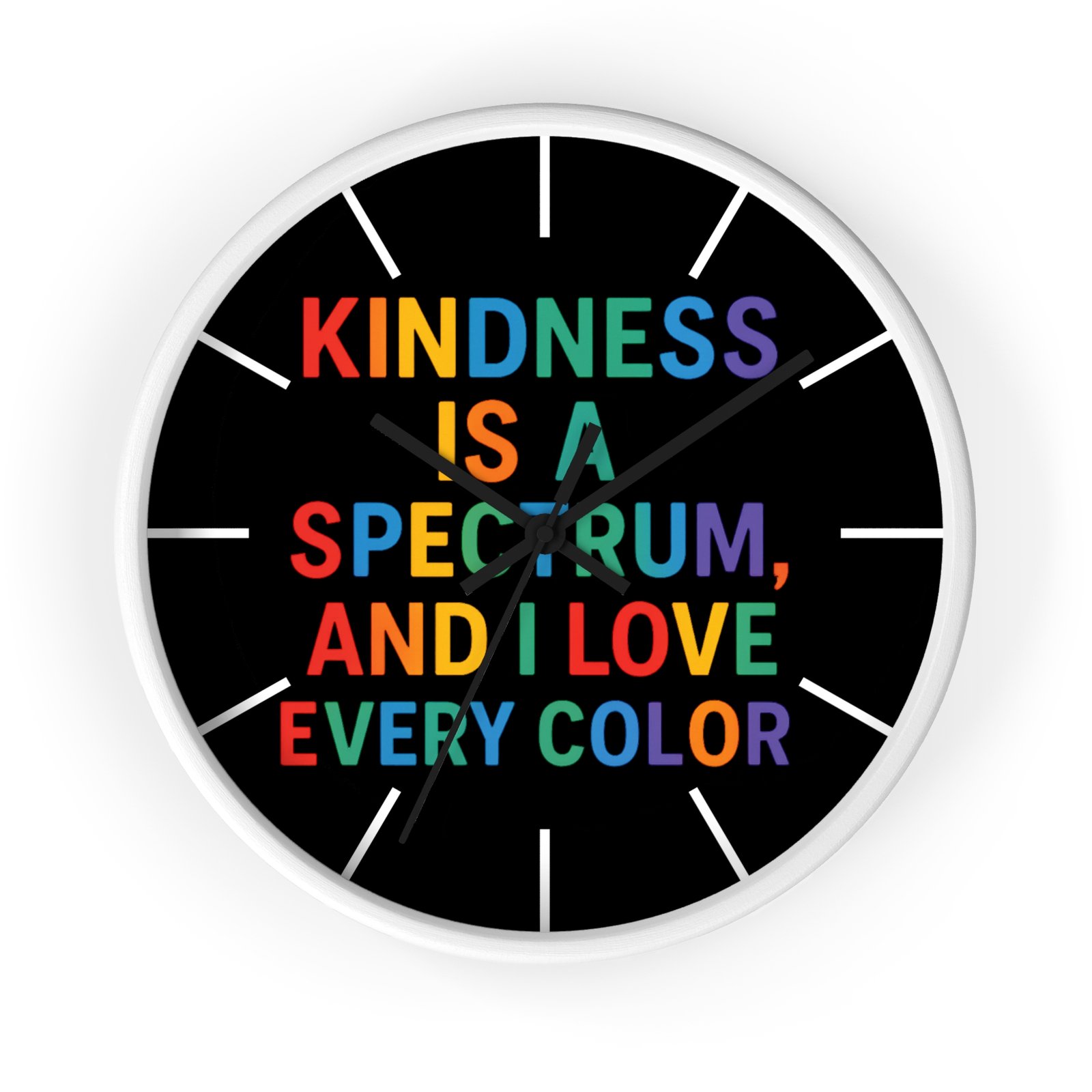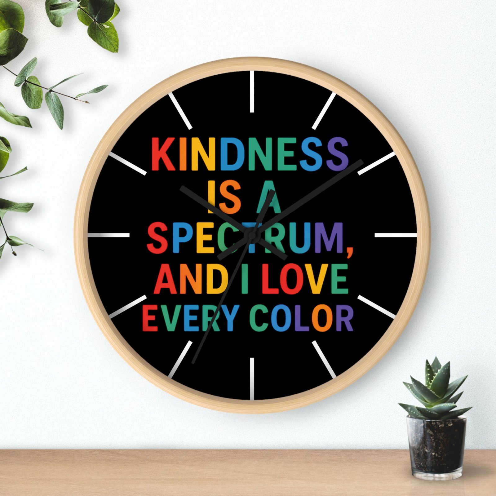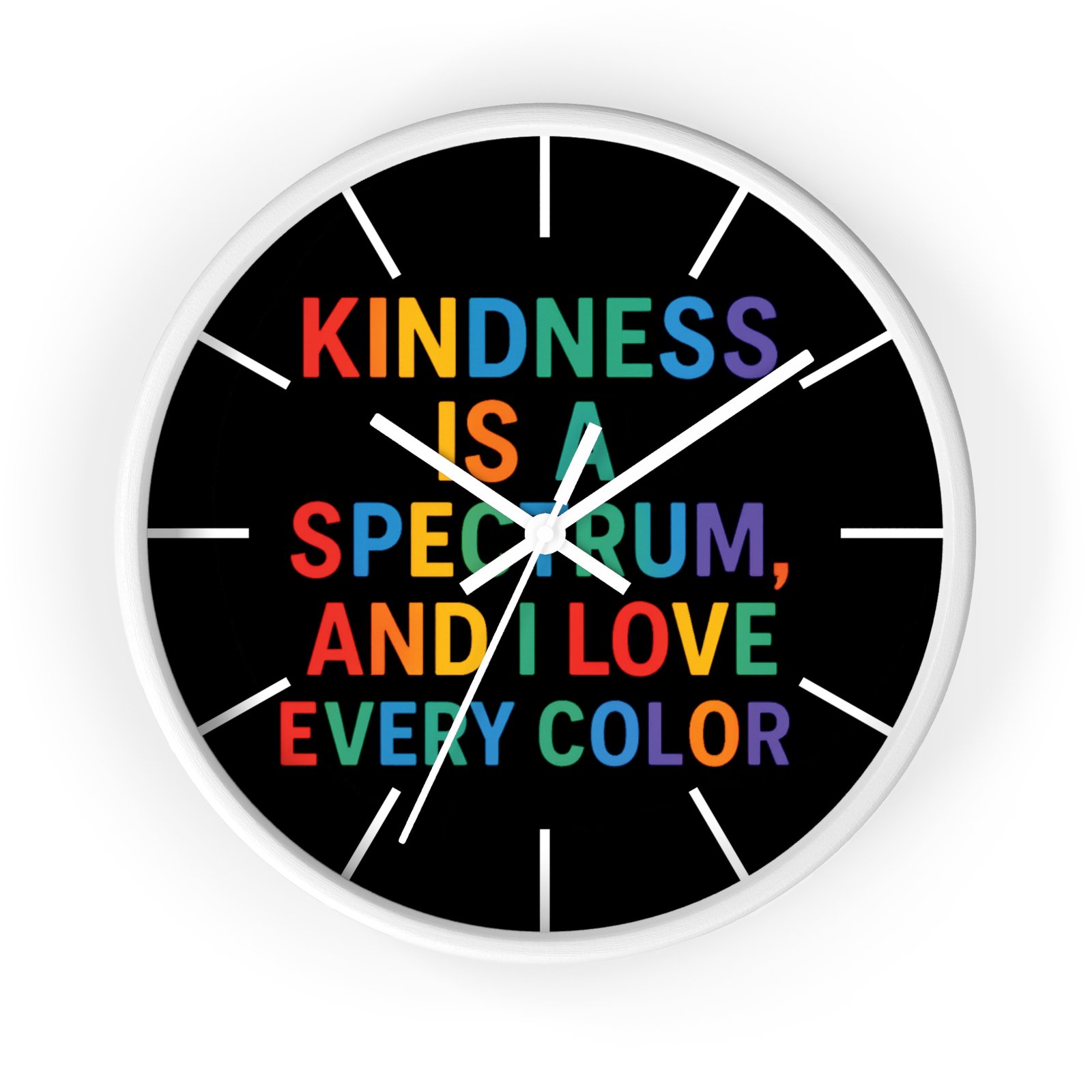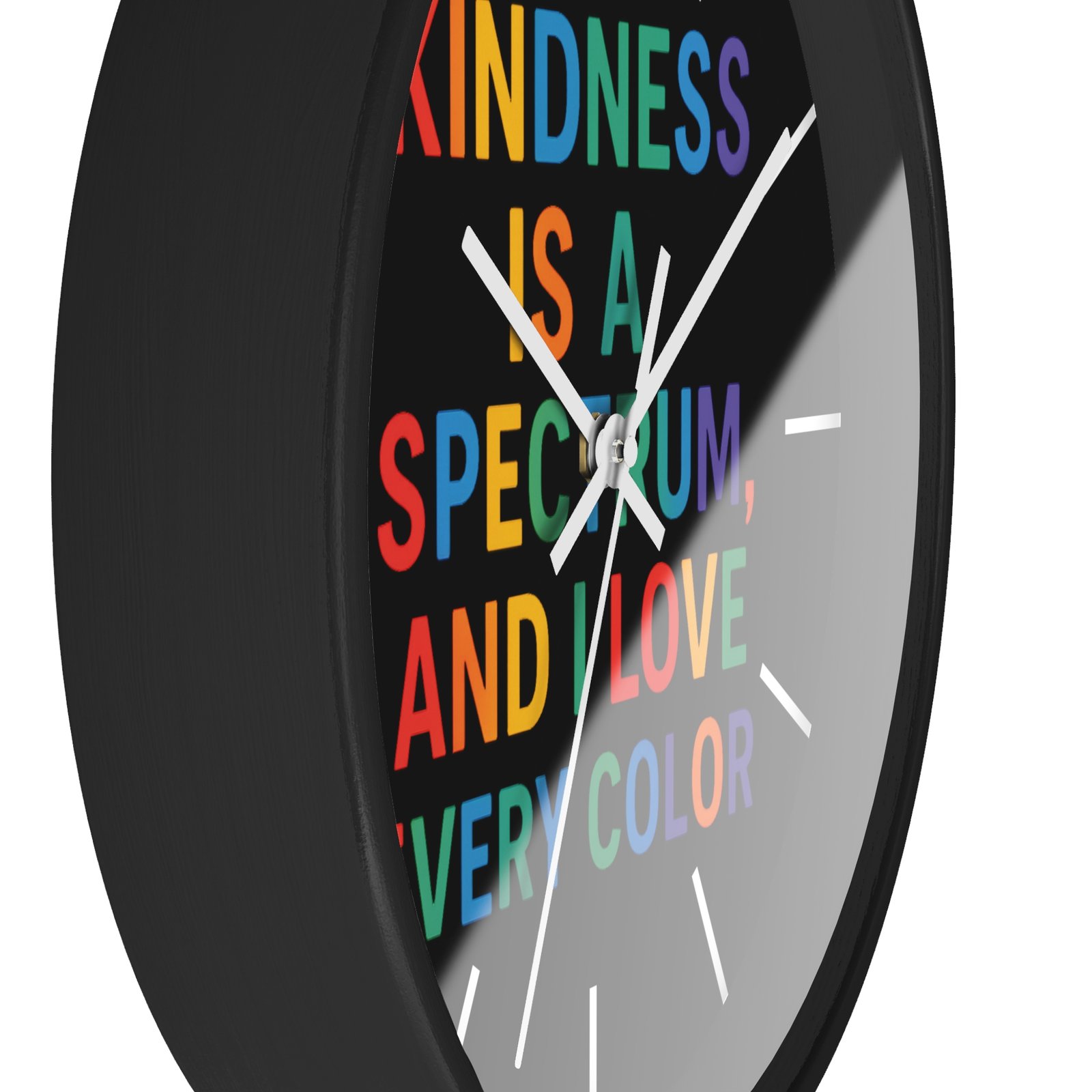 Brighten up your space with this vibrant wall clock, a perfect blend of style and functionality. Its eye-catching design, featuring the uplifting phrase “Kindness is a spectrum, and I love every color,” creates a cheerful atmosphere in any room. Ideal for those who value positivity and creativity, this clock is a wonderful addition to home offices, children’s rooms, or art studios. Great for buyers looking to express their individuality and spread joy. Perfect for holidays, birthdays, or just as a thoughtful gift to motivate friends and family to embrace kindness every day.