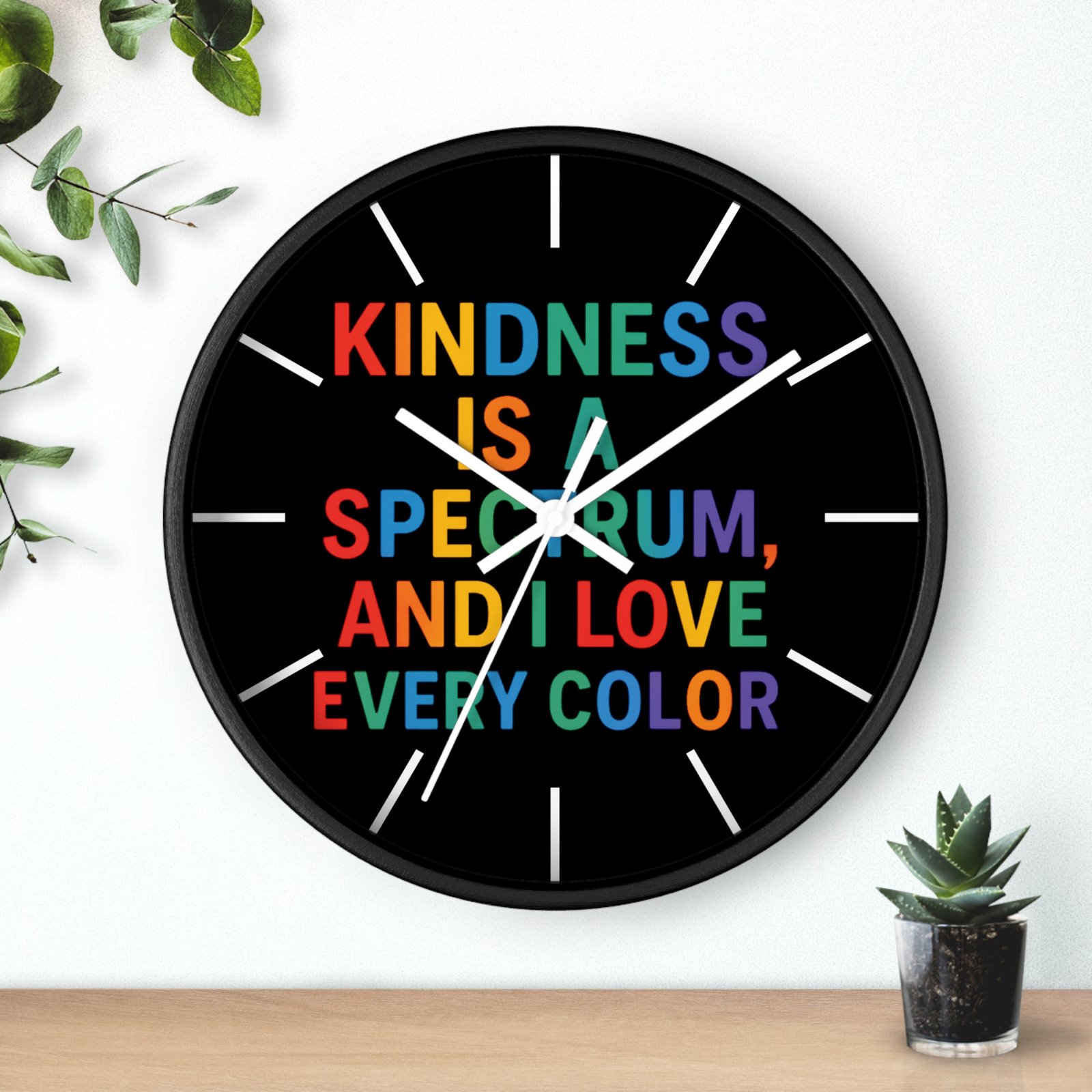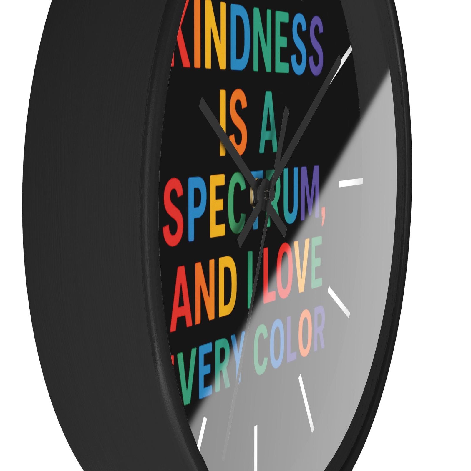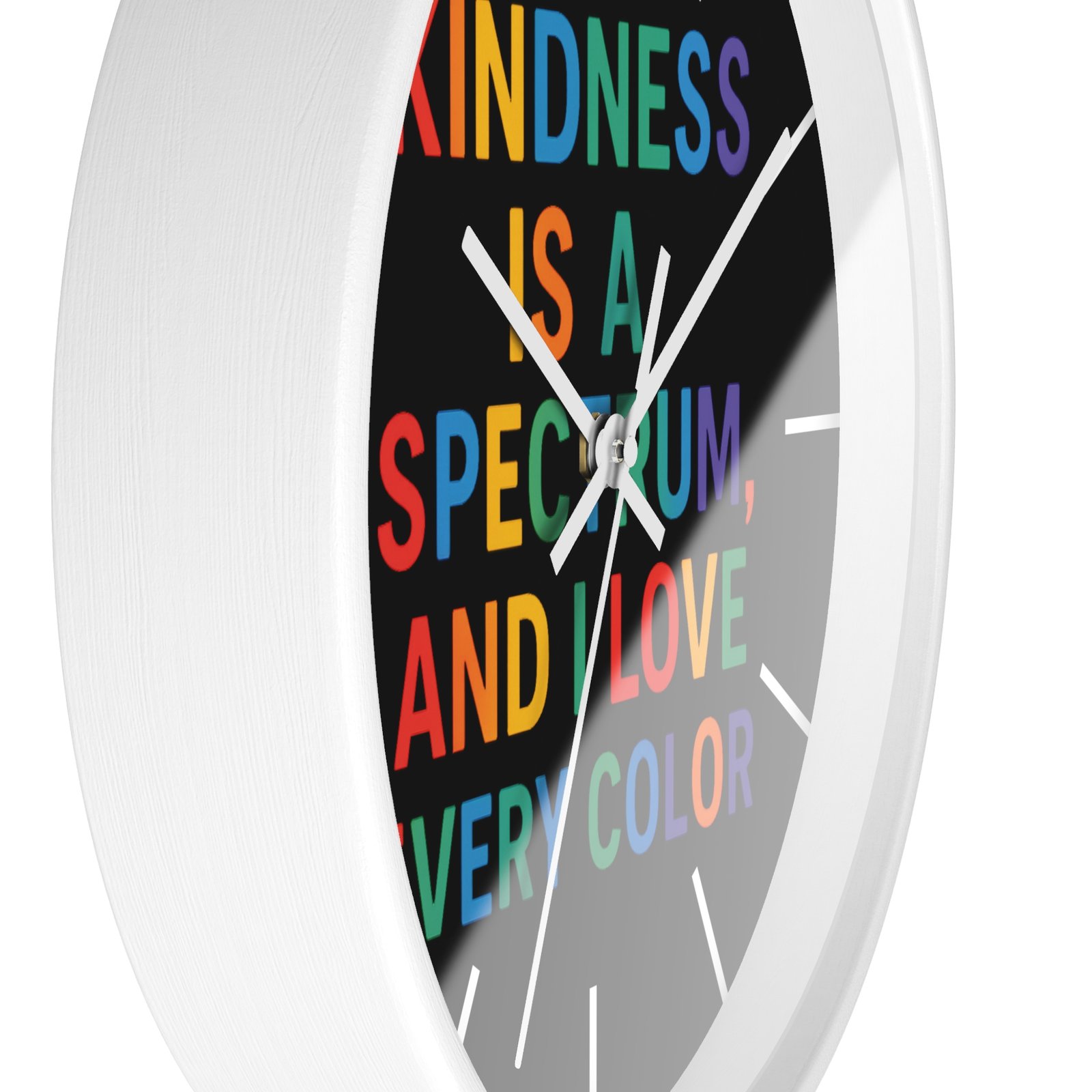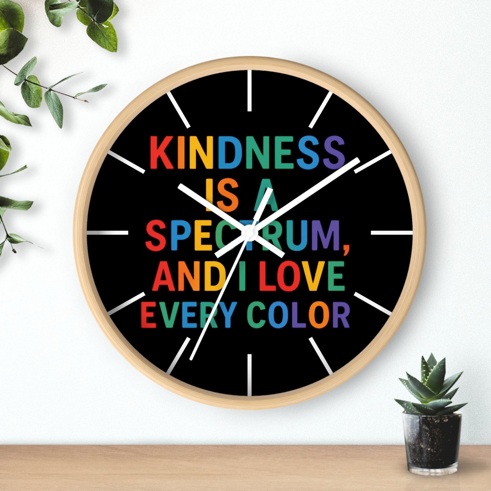 Brighten up your space with this vibrant wall clock, a perfect blend of style and functionality. Its eye-catching design, featuring the uplifting phrase “Kindness is a spectrum, and I love every color,” creates a cheerful atmosphere in any room. Ideal for those who value positivity and creativity, this clock is a wonderful addition to home offices, children’s rooms, or art studios. Great for buyers looking to express their individuality and spread joy. Perfect for holidays, birthdays, or just as a thoughtful gift to motivate friends and family to embrace kindness every day.