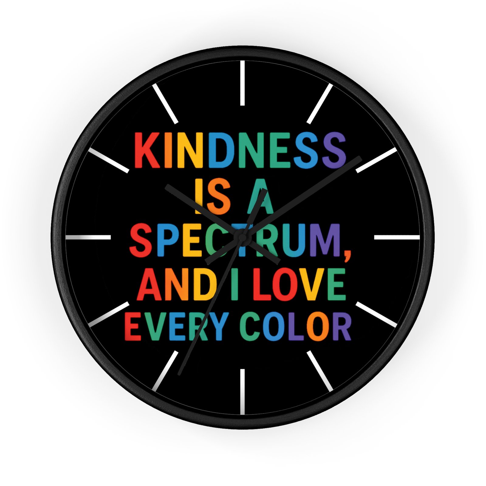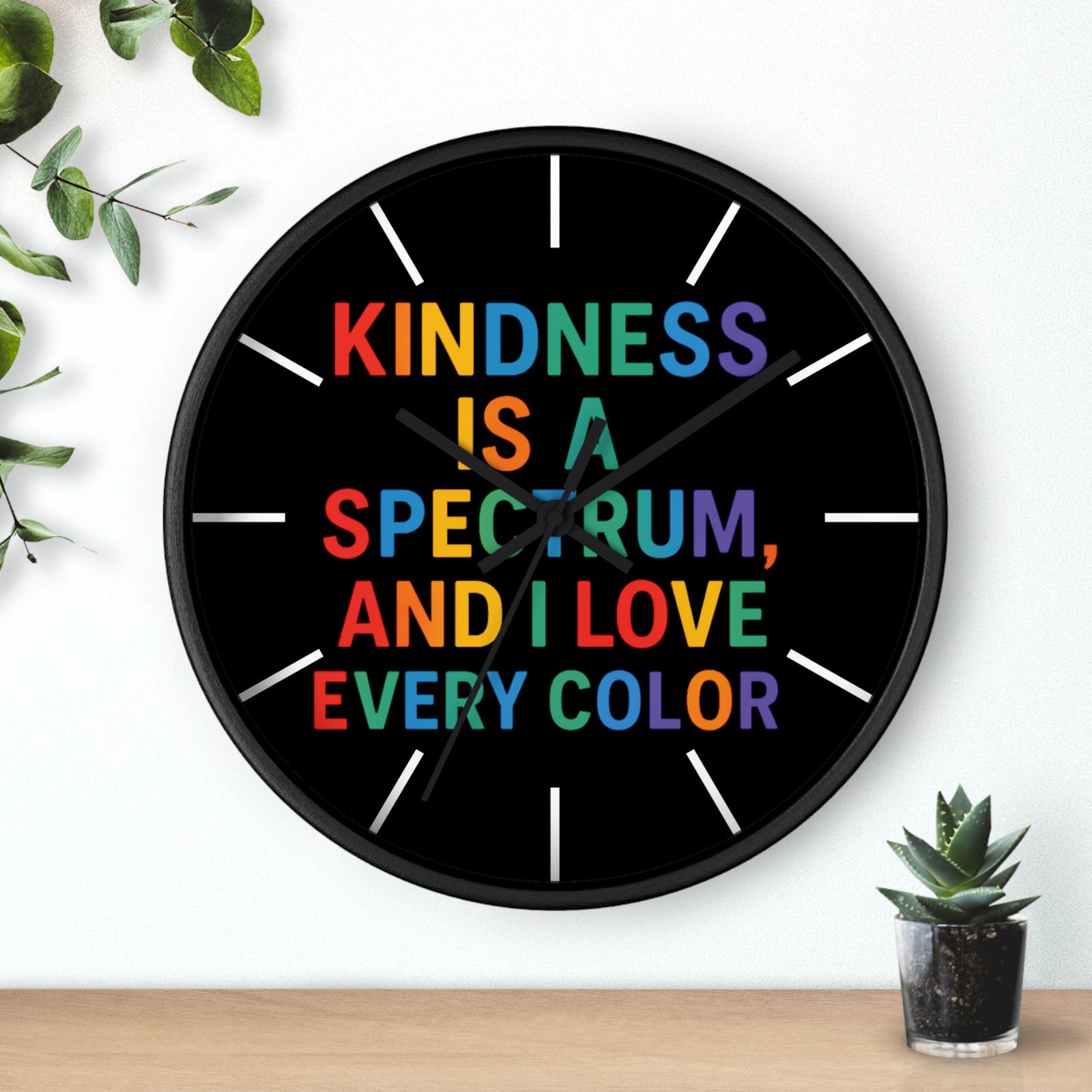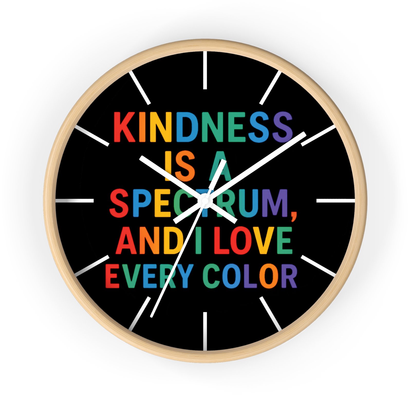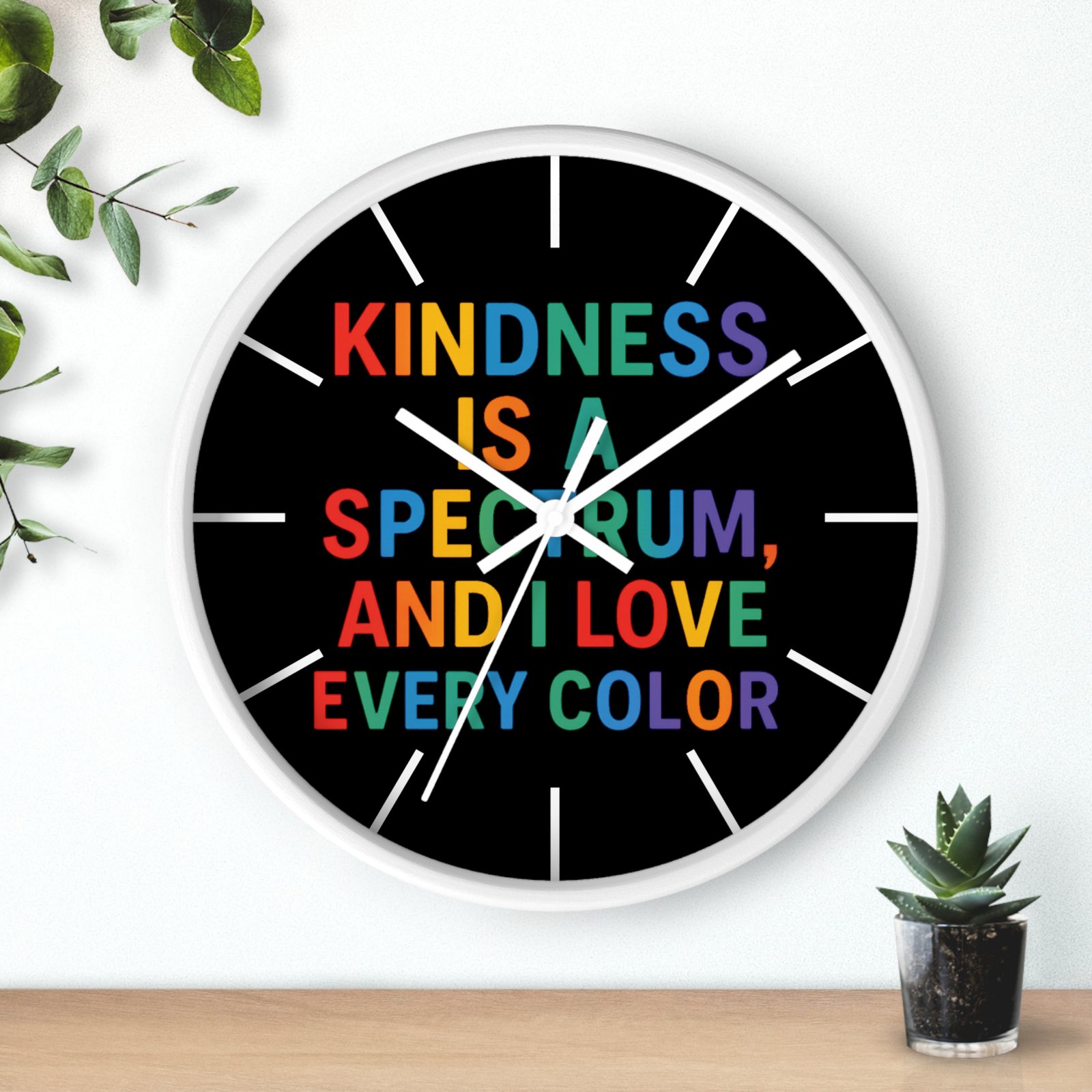 Brighten up your space with this vibrant wall clock, a perfect blend of style and functionality. Its eye-catching design, featuring the uplifting phrase “Kindness is a spectrum, and I love every color,” creates a cheerful atmosphere in any room. Ideal for those who value positivity and creativity, this clock is a wonderful addition to home offices, children’s rooms, or art studios. Great for buyers looking to express their individuality and spread joy. Perfect for holidays, birthdays, or just as a thoughtful gift to motivate friends and family to embrace kindness every day.