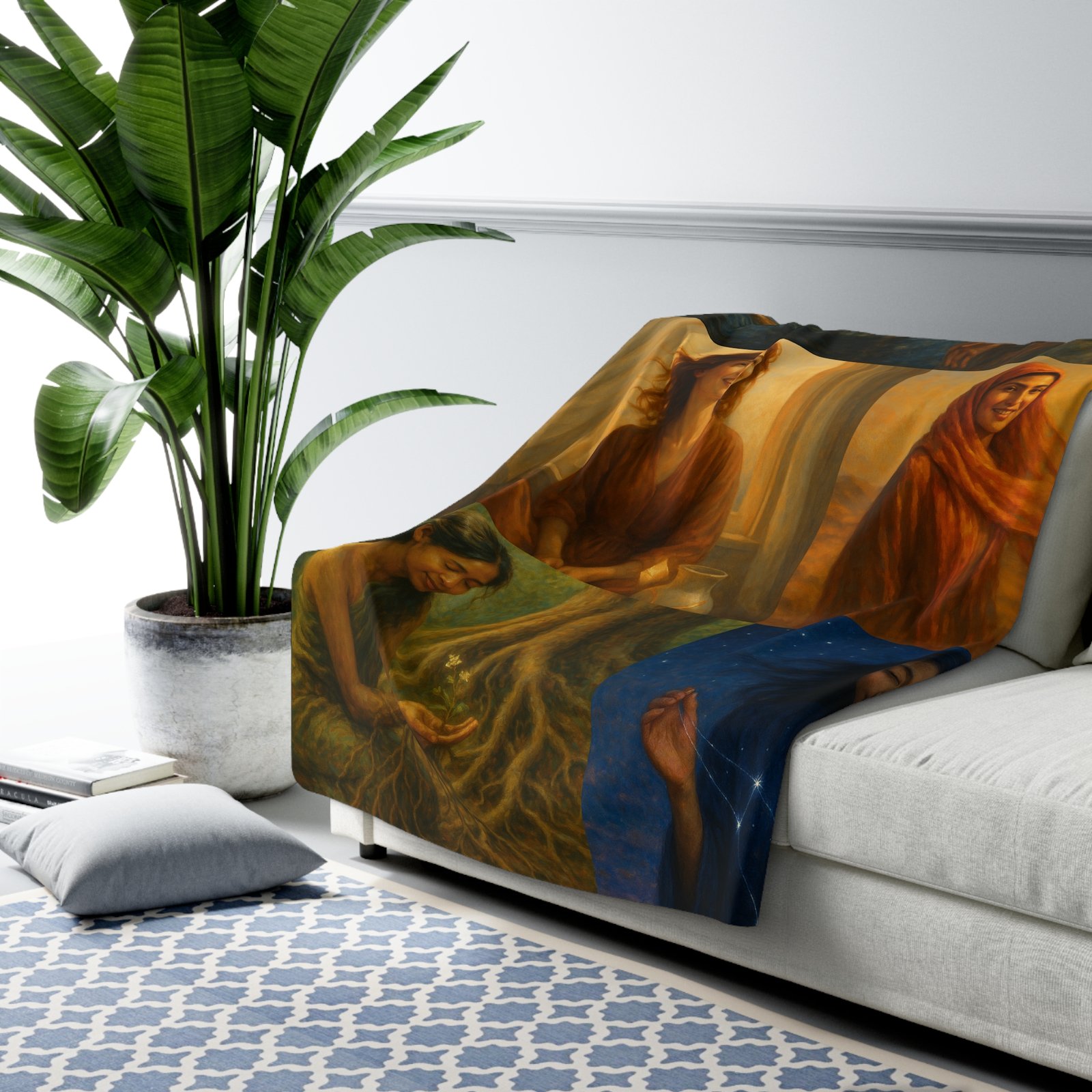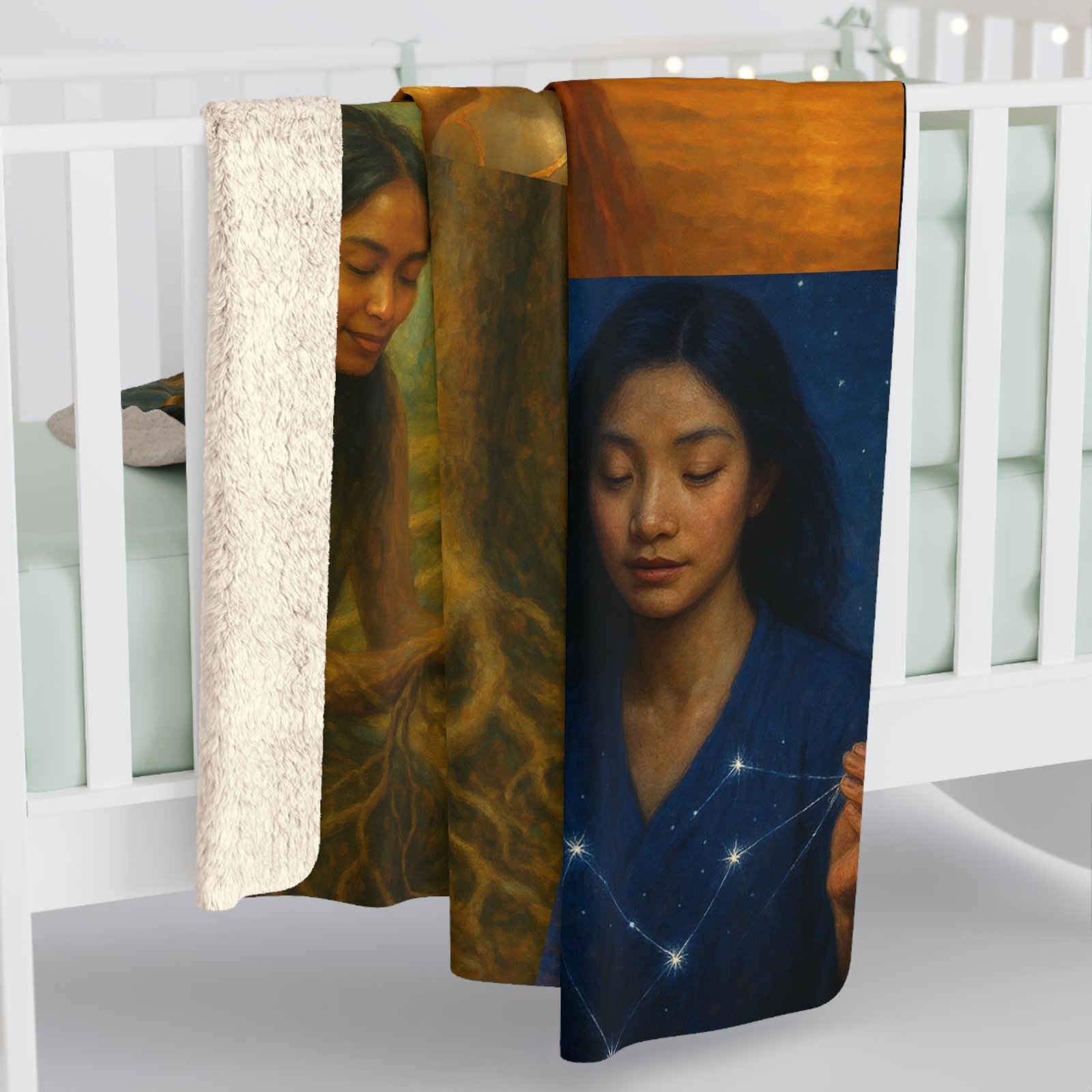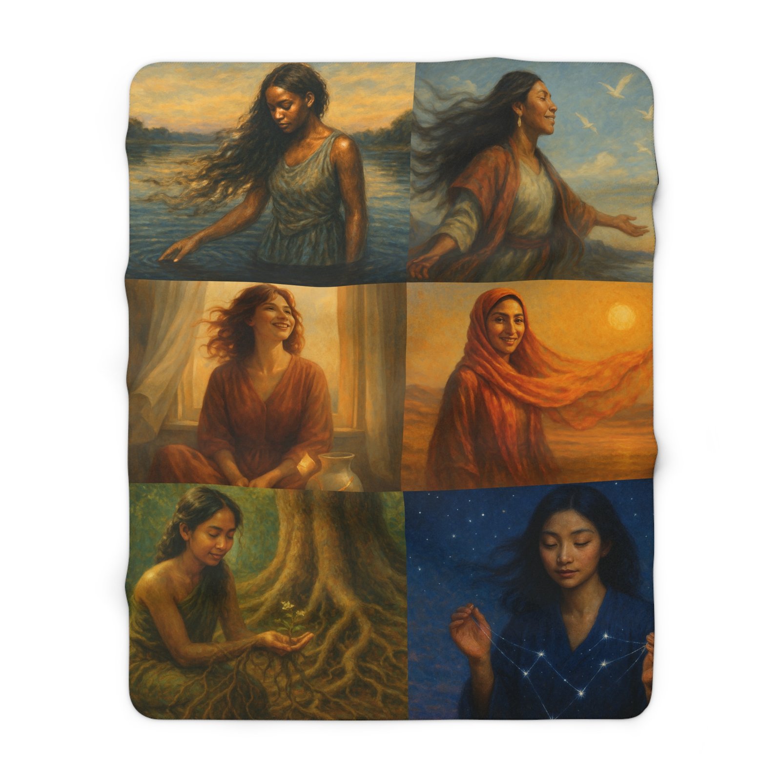 Wrapped in warm, velvety sherpa, this blanket feels like a quiet evening by the sea and a sunlit window at once. The subtle, art show women in moments of calm—gazing at the horizon, cradling small joys, and finding stillness beneath stars. It settles over shoulders and laps with a gentle weight, turning ordinary nights into small rituals: reading by lamp light, settling into meditation, or sharing stories on a cool porch. For people who treasure, meaningful moments, the blanket becomes a companion and conversation piece—soft to the touch, holding warmth and a sense of quiet wonder every time it’s used.